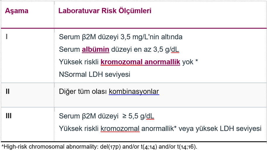 Multipl miyelom genellikle Uluslararası Evreleme Sistemi (ISS) kullanılarak evrelendirilir. Sistem dört temel hususa odaklanmaktadır: